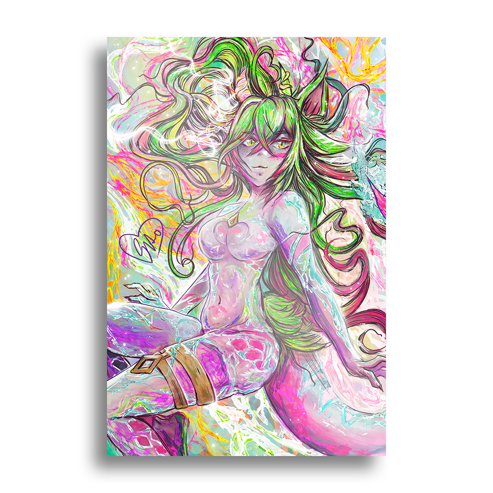 A stunning print of Suto's VTuber model as a traditional painting, brought to life with vibrant details and a luminous design. Inspired by Hextech and Arcane aesthetics, it showcases glowing magical elements and crystalline highlights. Suto’s hybrid cat-axolotl features, including her four cat ears, tail, and elegant horns are beautifully rendered with an ethereal backdrop enhancing the captivating artistry.